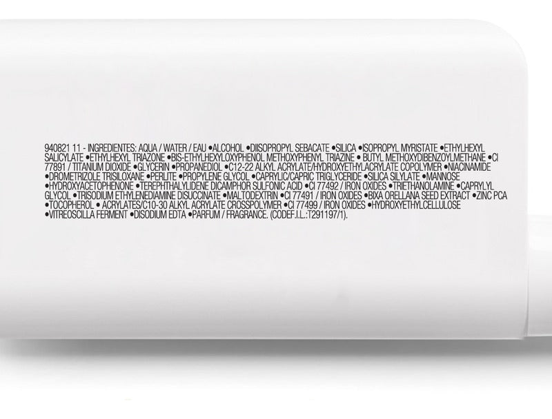Aqua/Water/Eau, Alcohol, Diisopropyl Sebacate, Silica, Isopropyl Myristate, Ethylhexyl Salicylate, Ethylhexyl Triazone, Bis-Ethylhexyloxyphenol Methoxyphenyl Triazine, Butyl Methoxydibenzoylmethane, Glycerin, Propanediol, C12-22 Alkyl Acrylate/Hydroxyethylacrylate Copolymer, Niacinamide, Drometrizole Trisiloxane, Perlite, Propylene Glycol, Caprylic/Capric Triglyceride, Silica Silylate, Mannose, Hydroxyacetophenone, Terephthalylidene Dicamphor Sulfonic Acid, Triethanolamine, Caprylyl Glycol, Trisodium Ethylenediamine Disuccinate, Maltodextrin, Bixa Orellana Seed Extract, Zinc Pca, Tocopherol, Acrylates/C10-30 Alkyl Acrylate Crosspolymer, Hydroxyethylcellulose, Vitreoscilla Ferment, Disodium Edta, Parfum / Fragrance.