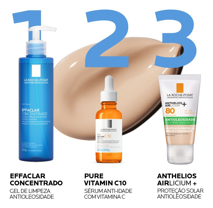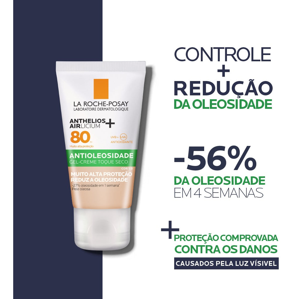 Protetor solar facial com cor. La Roche-Posay Anthelios Airlicium FPS80 protege e oferece um tratamento que reduz a oleosidade em 27% em apenas uma semana e 56% em um mês.