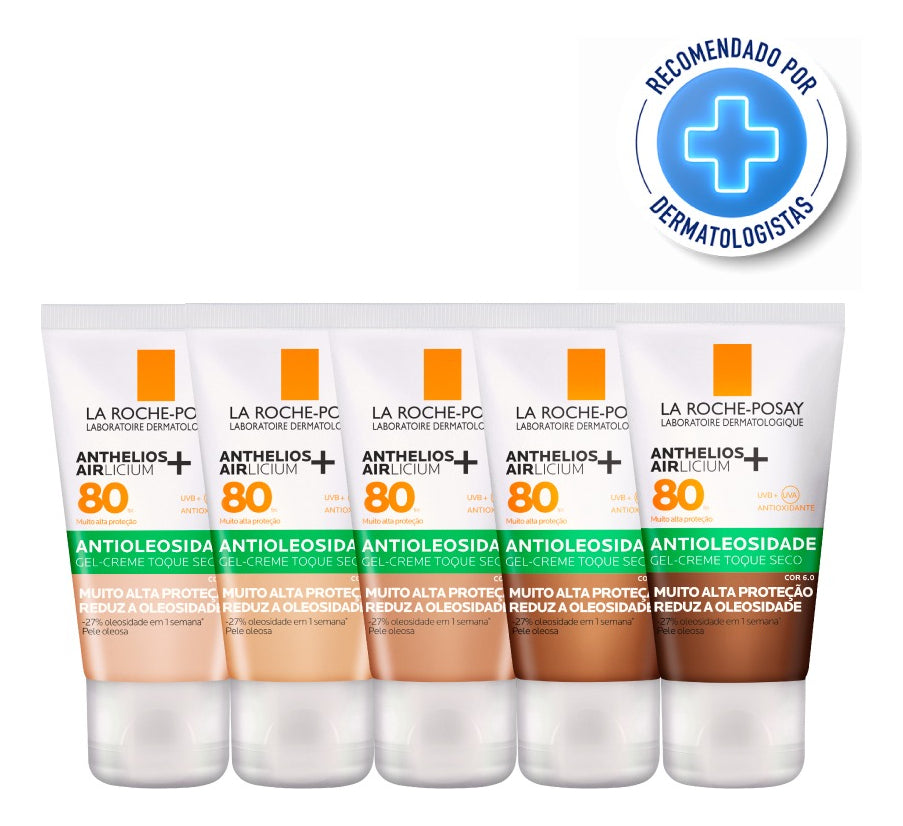 Protetor solar facial com cor. La Roche-Posay Anthelios Airlicium FPS80 protege e oferece um tratamento que reduz a oleosidade em 27% em apenas uma semana e 56% em um mês.