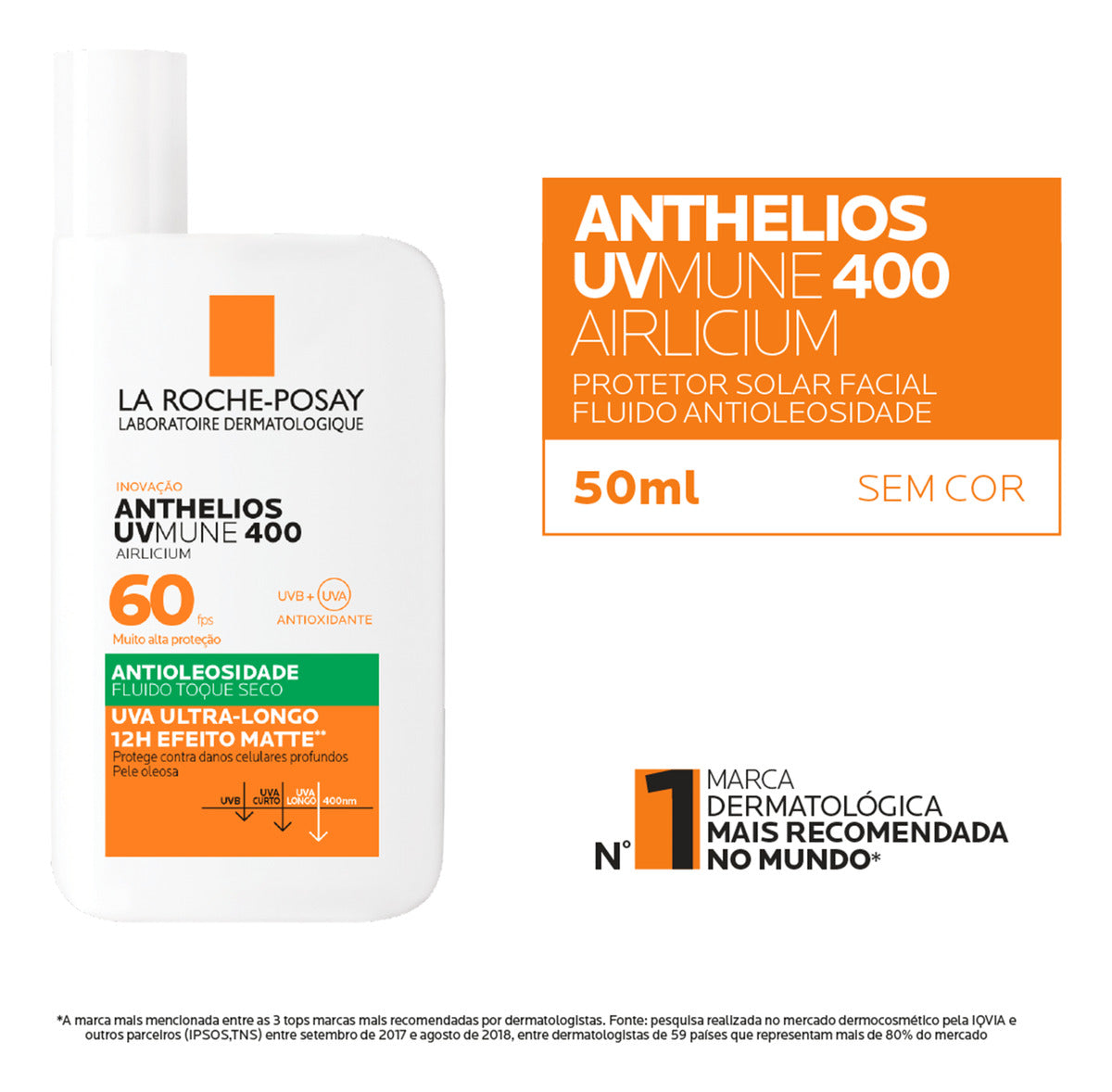 Protetor solar facial. La Roche-Posay Anthelios Airlicium Fluido FPS 50 oferece cuidado diário para a pele e ação antioleosidade.