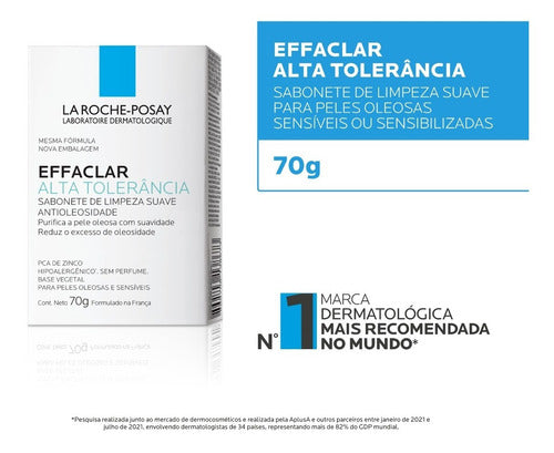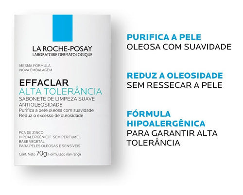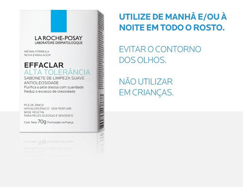 Sabonete La Roche-Posay Effaclar Alta Tolerância promove uma limpeza delicada, mas profunda, e remove toda a oleosidade em excesso, sem agredir a pele sensibilizada. Também auxilia no processo de renovação celular e mantém a hidratação da pele para evitar a sensação de repuxamento.