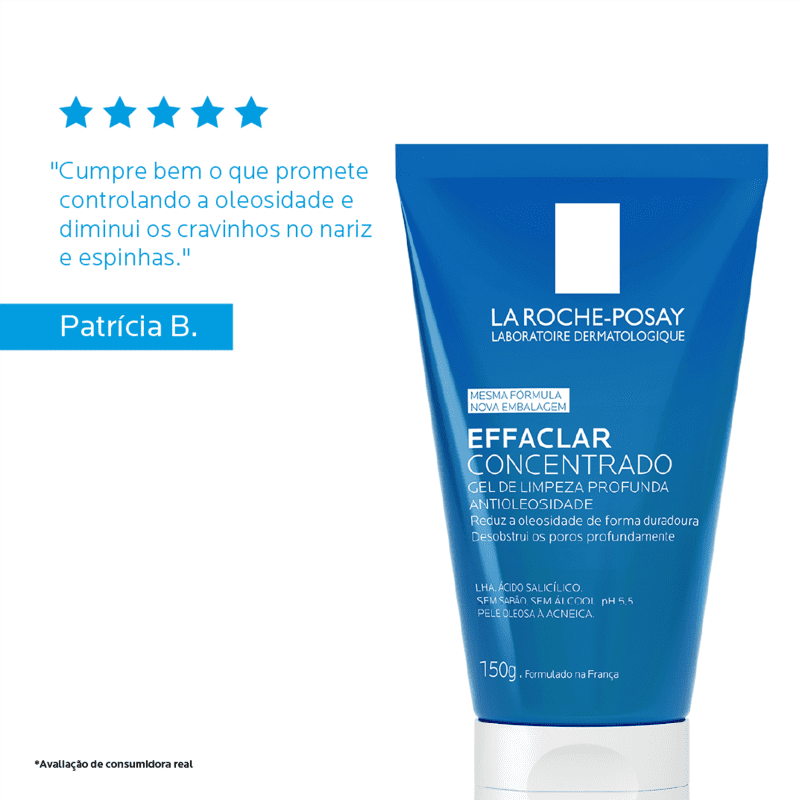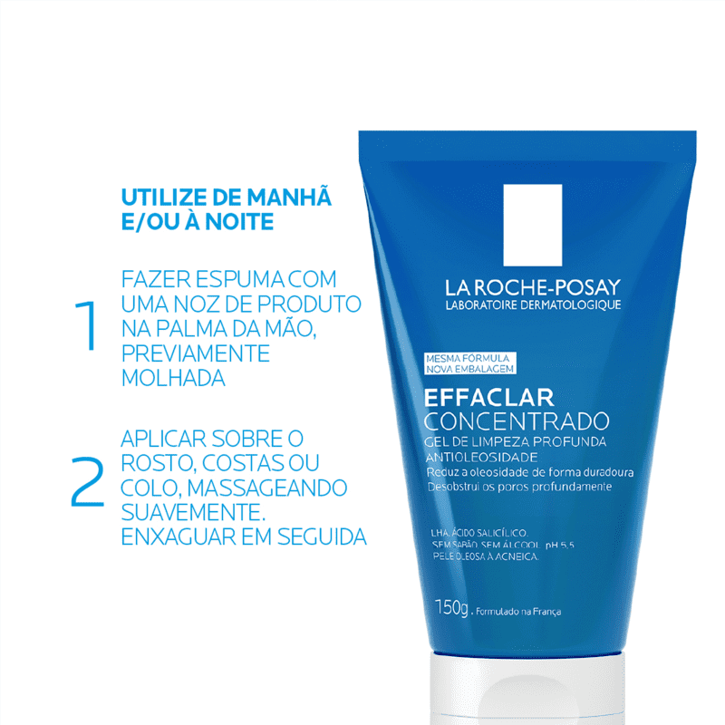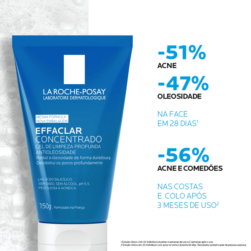 Com fórmula especialmente desenvolvida para suprir as necessidades da pele dos brasileiros, Effaclar Gel Concentrado traz uma combinação única de Ácido Salicílico, Zinco e LHA, ingredientes poderosos que proporcionam eficácia antiacne comprovada