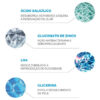 Sais de Zinco: controla a produção de queratina, desobstrui os poros, reduz a ocorrência de acne e regula a oleosidade cutânea.