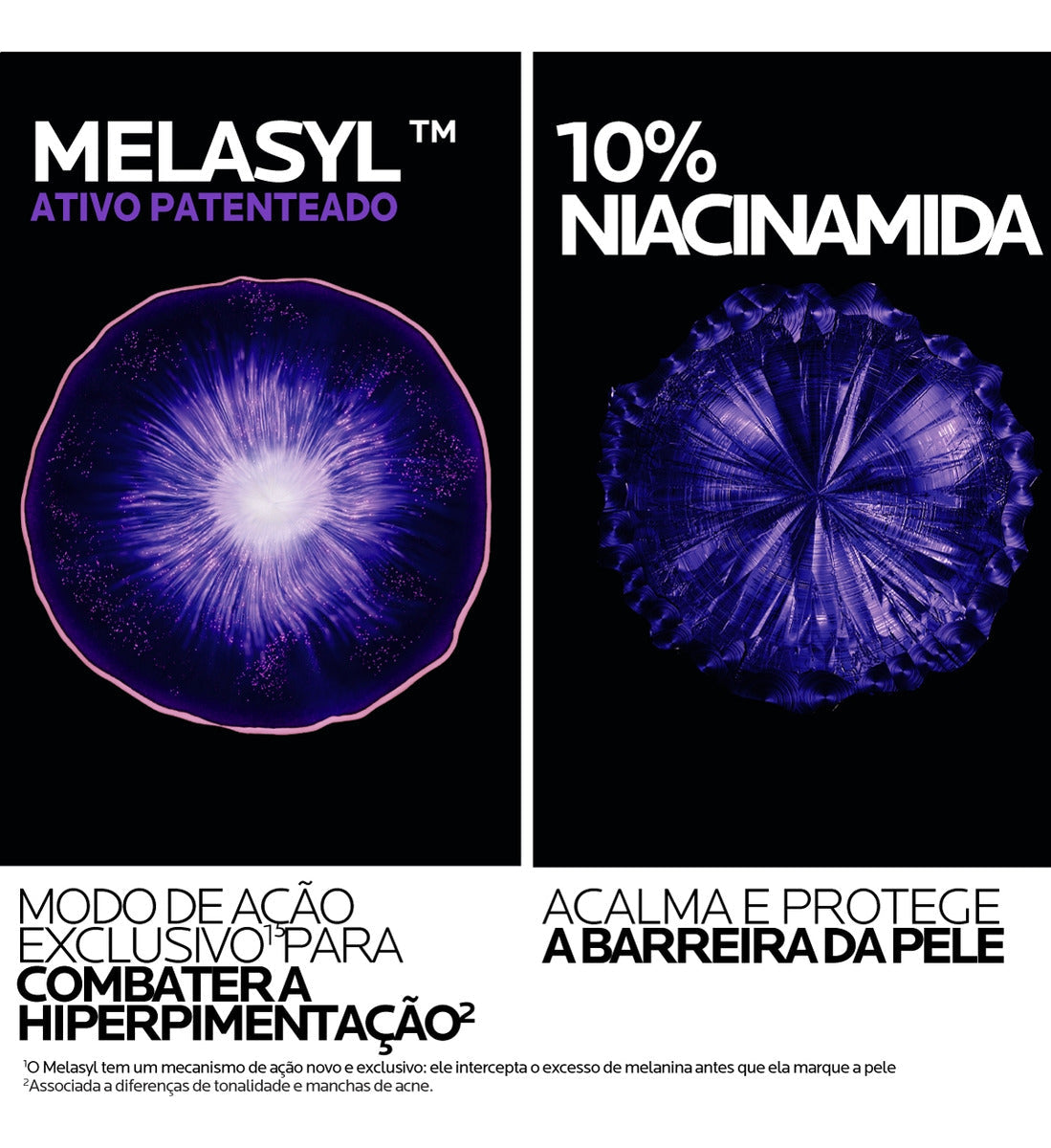 Melasyl™: Criado após 18 anos de pesquisa, Melasyl é um novo ativo patenteado com modo de ação novo e único para corrigir e prevenir marcas como nunca antes. Com eficácia clínica comprovada, ele intercepta o excesso de melanina antes que cause diferenças de tonalidade na pele.