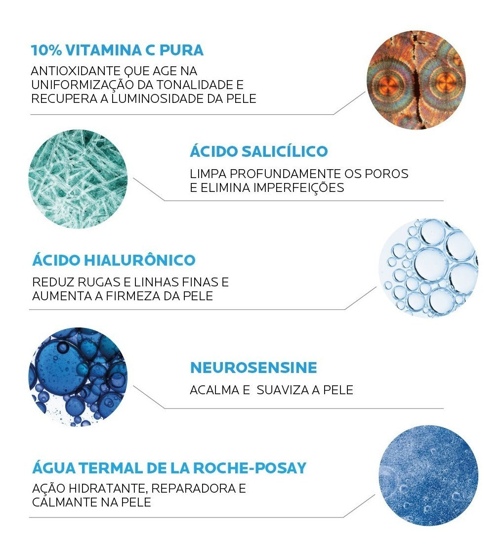 O Sérum Facial La Roche-Posay Pure Vitamin C10 possui textura leve, não oleosa e de rápida absorção que reduz linhas finas, suaviza poros dilatados, melhora o viço, a firmeza e acalma a pele do rosto. Ele conta com uma combinação única de ingredientes que garantem máxima eficácia e alta tolerância às peles sensíveis.